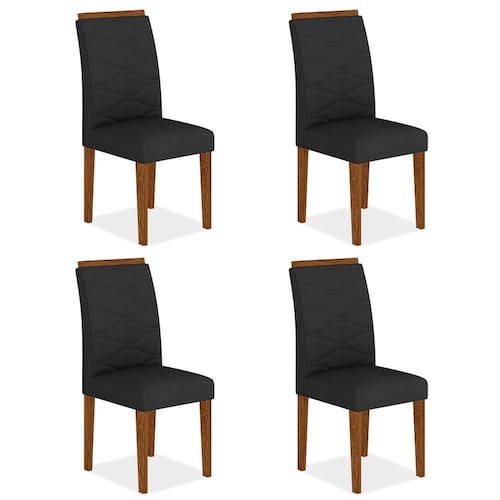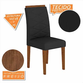 Detalhes Técnicos das Cadeiras: - Acabamento da Cadeira: Assento e Encosto Tapeçados - Almofada do Assento: Fixa - Cadeira Estofada: Sim - Peso Suporte da Cadeira: 90 KG - Facilidade da Montagem: Medial - Tonalidade da Cadeira: Freijó - Tonalidade do Tecido: Suede Preto - Assento: D16 - Encosto: D14 - Tipo de Pintura: UV Texturizada - Material da Estrutura: MDF 25mm e 18mm - Medida da Cadeira: 100CM x 44CM x 50CM