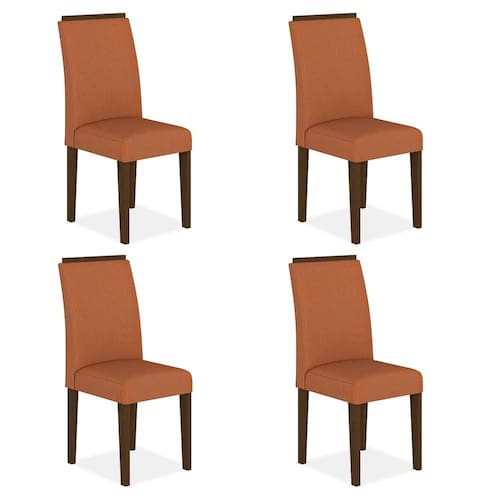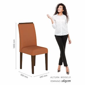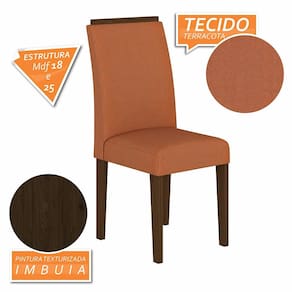 Detalhes Técnicos das Cadeiras - Assento e Encosto Tapeçados, Estofados e Fixos - Peso Suportado da Cadeira: 90 KG - Facilidade da Montagem: Média - Tonalidade da estrutura da Cadeira: Imbuia - Tonalidade do Tecido: Suede Terracota - Espuma do Assento: D16 - Espuma do Encosto: D14 - Tipo de Pintura: UV Texturizada - Material da Estrutura: MDF 25mm e 18mm - Medida da Cadeira: 97CM x 44CM x 50CM