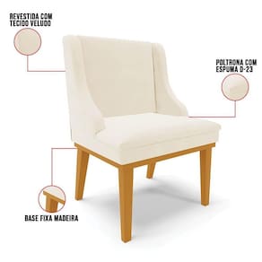 A Cadeira Lia é produzida em Madeira Eucalipto ecologicamente correta e a base fixa de madeira suporta até 120 kg, sem impacto. Seu estofamento é composto por espuma macia densidade D-23 e revestida em Veludo, tecido clássico, elegante, resistente, confortável e de toque macio.