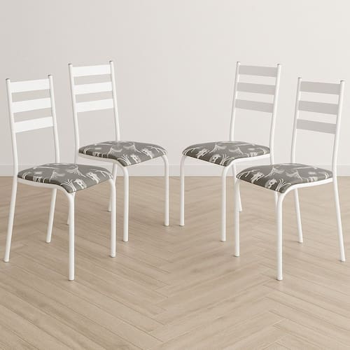 *Podem ocorrer variações de cores nos assentos das cadeiras em relação às fotos.* Acabamento: Brilhante Altura do assento até o chão: 44 cm Ambiente Principal: Cozinha codigo_ean: 7900288206046 Complexidade da Montagem: Baixa: pode ser montado por uma pessoa sozinha Cor: Branco/Preto Floral Cor do Produto: Branco/Preto Floral Cor dos Pés: Branco Dobrável: Não Escala de Brilho: Brilhante Estrutura do Encosto: Aço Giratória: Não Itens Inclusos: 4 Cadeiras, Kit Ferragens e Manual de Montagem Manual de Montagem e Instalação: https://product-hub-prd.madeiramadeira.com.br/595206386/documents/0ef44053-7dd1-4fea-86c4-add1cdd308a03117189654817543354281428.pdf Marca: MBM DECOR Material dos Pés: Aço Material Principal: Aço Necessita Montagem: Sim Origem do Produto: Nacional Peso: 2,9 kg Possui Apoio para Braços: Não Possui Apoio Para os Pés: Não Possui Assento/Encosto Estofados: Possui Somente o Assento Estofado Possui Rodízio: Não Recomendações de Uso, Manutenção e Limpeza: Limpar com pano úmido. Uso recomendado para adultos e áreas internas. Sistema de Montagem: Já vai com todos parafusos necessários. Necessíta chave Philips. Tipo de Assento: Fixo Tipo de Encosto: Fixo Marca: Não Informado