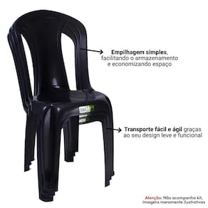 Características Técnicas: Produzida em polipropileno Confortável, resistente e com design moderno Produto monobloco, empilhável e fácil de limpar e transportar Não possui braço Conjunto 4 cadeiras plásticas preto Capacidade de até 182 kg Certificada pelo Inmetro