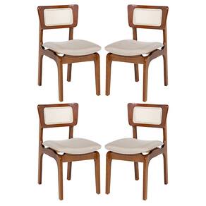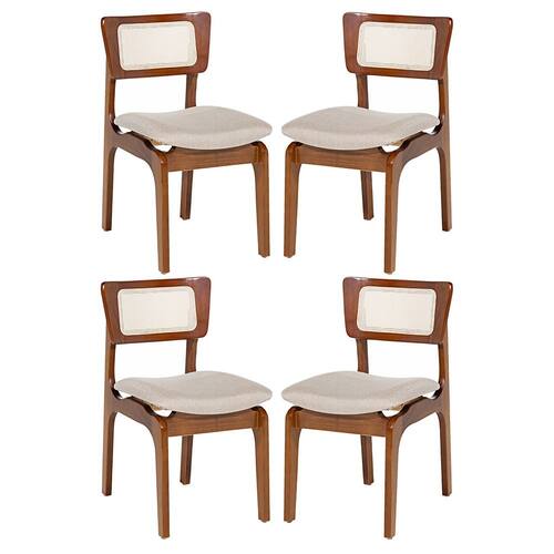 CARACTERÍSTICAS TÉCNICAS: - Produzido em Madeira Maciça Sustentável - Acabamento em Verniz na cor Imbuia - Encosto com Revestimento em Rattan com Fibra Sintética Quadriculada na cor Bege - Assento Estofado Preenchido com Espuma D23 - Assento com Revestimento em Linho Bege M58 - Cadeira Entregue Montada *Kit Composto por Quatro Cadeiras Portugal