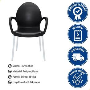 DESCRIÇÃO - A Cadeira Tramontina Grace Preto em Polipropileno com Braços da linha Summa criou moda e revolucionou o mercado com um design diferenciado. - Perfeita para ambientes residenciais ou corporativos, está disponível em duas versões: Grace rodízio e Grace 04 pernas. - A Cadeira Tramontina Grace Camurça em Polipropileno com Braços Polidos é leve e resistente. - Para evitar acidentes, não se apoie nas duas pernas traseiras ou suba no assento. - Submetida a rigorosos testes de qualidade, a cadeira resiste a uma carga estática de até 154 kg.