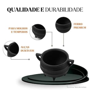 Kit 4 Caldeirões Tripé Miniatura 6 cm 100ml em Ferro Fundido Panela Mineira - Especificações TécnicasDimensões Produto (Compr. X Larg. X Alt.): 6 x 6 x 5,5 cm.