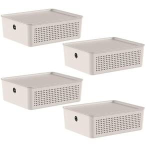 Kit 4 Cestos Organizadores Flow Bege com Tampa 5,4L Empilháveis Lavanderia Acessórios.