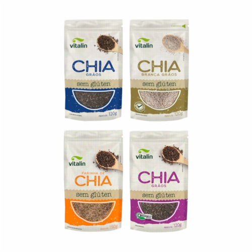 Kit 4 Chia Vitalin: Grãos Preta, Grãos Branca, Farinha, Grãos Orgânica