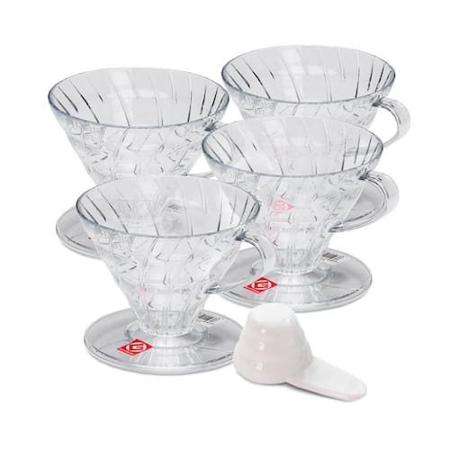 Kit 4 Coadores De Café Em Acrílico Transparente Hario V60-01 Prepare um saboroso café para você e suas visitas com o inovador Kit de 4 Coadores de Café em Acrílico Transparente Hario V60-01. - Kit composto por 4 coadores Hario - Coadores Hario do tipo V60-01 tamanho 01 - 4 Colheres de plástico inclusas Ean: 2960002296710