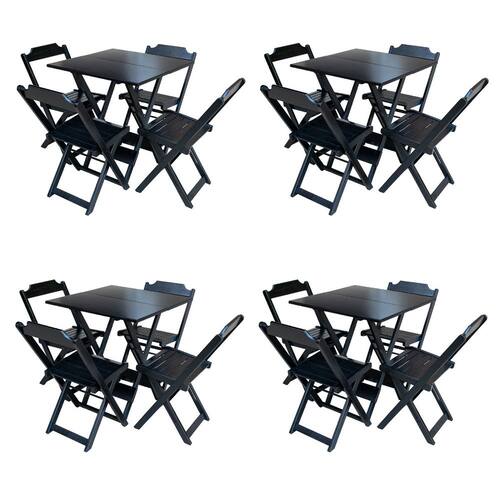 Kit 4 Conjuntos De Mesa Com 4 Cadeiras De Madeira Dobravel 70x70 Preto é ideal para bares, restaurantes, estabelecimentos, áreas de lazer e tambem para sua casa. Feito em madeira maciça, tornando resistentes e duráveis. Seu design permite que seja encaixado em qualquer ambiente, trazendo um toque a mais para seu estabelecimento. Além de sua durabilidade, o que lhe trará conforto para servir seus clientes. Por ser dobrável torna-se mais fácil guardar, manusear e limpar o produto. Atenção: EVITE USAR PRODUTOS ABRASIVOS E QUíMICOS PARA LIMPEZA DO PRODUTO, aconselha-se o uso de pano umedecido para melhor conservação; mantenha o produto fora de chuva e sol constantes MESA Cor: Preto Modelo: Dobravel Dimensões: Altura 76cm | Largura 70cm | Profundidade 70cm CADEIRA Cor: Preto Modelo: Dobravel Dimensões: Altura 80cm | Largura 45cm | Profundidade 42cm