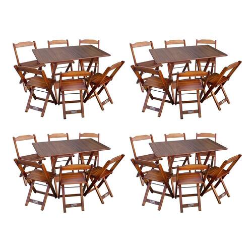 Kit 4 Conjuntos De Mesa Dobráveis De Madeira 70x110cm Com 6 Cadeiras Imbuia O Conjunto Dobrável é ideal para bares, restaurantes, estabelecimentos, áreas de lazer e também para sua casa. Em madeira tornando-os resistentes e duráveis, seu design permite que esse conjunto seja encaixado em qualquer ambiente, trazendo um toque a mais para seu estabelecimento. Além de sua durabilidade, o que lhe trará conforto para servir seus clientes. Por ser dobrável torna-se mais fácil guardar, manusear e limpar o produto.