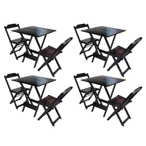 Kit 4 Conjuntos De Mesa Dobravel Com 2 Cadeiras De Madeira 70x70 Ideal Para Bar E Restaurante - Tabaco é ideal para bares, restaurantes, estabelecimentos, áreas de lazer e também para sua casa. Seu design permite que seja encaixado em qualquer ambiente, trazendo um toque a mais para seu estabelecimento. Além de sua durabilidade, o que lhe trará conforto para servir seus clientes. Por ser dobrável torna-se mais fácil guardar, manusear e limpar o produto. Atenção: EVITE USAR PRODUTOS ABRASIVOS E QUíMICOS PARA LIMPEZA DO PRODUTO, aconselha-se o uso de pano umedecido para melhor conservação; mantenha o produto fora de chuva e sol constantes. Dimensões: Medidas da Mesa: Altura: 76cm Largura: 70cm Comprimento: 70cm