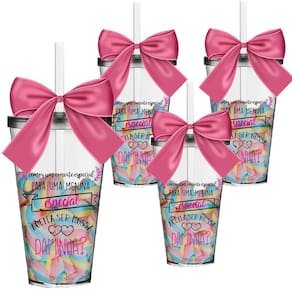 4 Copos Convite com Tampa e Canudo Transparentes com 4 Laços em Cetim Rosa.