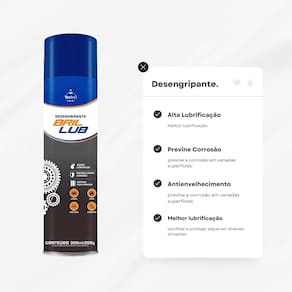 Alto Poder de Desengripamento: Solta porcas e parafusos emperrados e elimina rangidos. Proteção e Lubrificação: Repelente à água em componentes automotivos e previne a corrosão em variadas superfícies. Fácil de Usar: Inclui um prolongador para melhor alcance em áreas complicadas. Ficha Técnica Capacidade: 300ml Aplicação: com prolongador Ideal para: Carros, casa, escritório, indústria, e lazer
