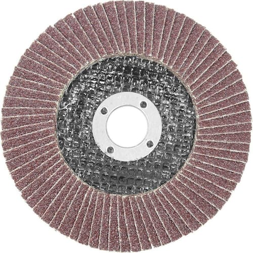 Disco de desbaste tipo flap sextavado e feito de lixas retangulares na base de tecido que são situadas como um leque com fibra de vidro como material de base. utilizado em trabalhos de polimento de metal, madeira e outros materiais.
