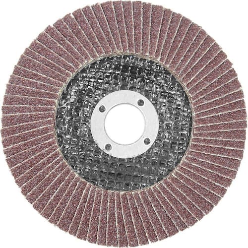 Disco de desbaste tipo flap sextavado e feito de lixas retangulares na base de tecido que são situadas como um leque com fibra de vidro como material de base. em trabalhos de polimento de metal, madeira e outros materiais.