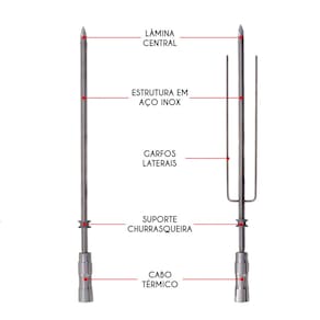 ITENS INCLUSOS: - 3 Espetos Simples (AxLxP): 3,5 x 3,5 x 65cm - 1 Espeto Triplo (AxLxP): 3,5 x 7 x 65cm