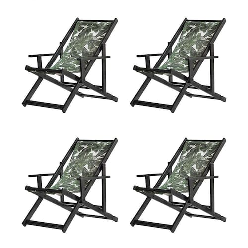 Kit 4 Espreguiçadeiras Dobrável Black Cb-folhas Verdes 4 ESPREGUIÇADEIRAS ENVERNIZADAS BLACK C/BSabe aquele final de tarde que você tanto espera para tirar um descanso merecido? Ou aquela viagem para a praia programada a meses com a família? Pois é, nossas cadeiras espreguiçadeira serve exatamente para esses momentos, com várias opções de cores, os tecidos além de charmosos são hidro-repelentes e se adequam a qualquer ambiente, facilmente removíveis para higienização.Estrutura 100% de madeira maciça e verniz especial, que garante sua qualidade e durabilidade, a espreguiçadeira é totalmente dobrável e reclinável (4 posições de ângulo), com descanso para braço, sendo possível montar invertida sem o encosto de braço, perfeita para seu lazer em todos os ambientes, seja ele externo ou interno, esse é o item que definitivamente não pode faltar na vida de quem de fato, quer aproveitar bons momentos! FICHA TÉCNICA DO PRODUTO:04 Níveis de Regulagem de Altura;Tecido Reforçado;Fabricada em Madeira Maciça Pinus;Peso aproximado: 7,5 Kg;Suporta aproximadamente 120 kg;Cor da Madeira: Preta Dimensões aproximadas do Produto:Altura 1: 69 cm;Altura 2: 82 cm;Altura 3: 91 cm;Altura 4: 100 cm;Profundidade: 105 cm. Dimensão aproximada total:Comprimento: 135 cm;Largura: 66 cm; Informações Adicionais:Garantia: 90 dias contra defeitos de fabricação.Acompanha 4 cadeiras Obs. A cor pode variar da foto conforme a tonalidade da madeira e iluminação.. !! Marca: Brasil Móveis