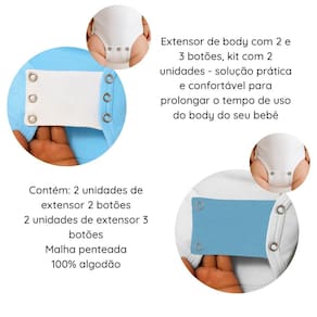 O Kit Extensor de Body é a solução prática e econômica para acompanhar o crescimento do seu bebê com mais conforto e menos desperdício. Ideal para prolongar o uso das roupinhas durante os surtos de crescimento.