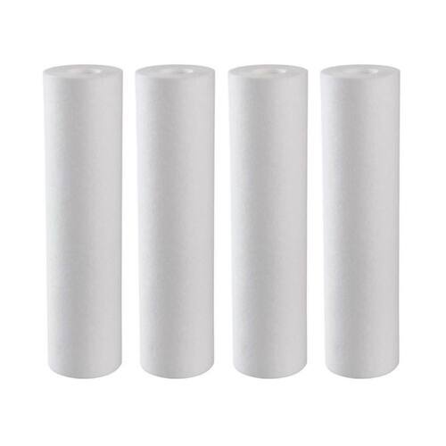 Kit com 4 cartuchos de polipropileno para filtração de água, remove impurezas e particulados. Dimensões de 10 x 2.1/2, grau de retenção de 5 micras, vazão máxima de 1000 litros/hora.Tipo