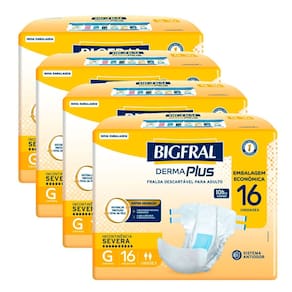 Rápida absorção Evitando que a umidade fique em contato com a pele por períodos prolongados. Extratos naturais hidratantes Exclusiva formula com extratos naturais que mantém a pele hidratada. Ajuda a prevenir irritações Desenvolvida especialmente para ajudar a prevenir irritações na pele. Barreiras antivazamento Proporciona proteção extra contra vazamentos, garantindo sensação de conforto e segurança. Sistema antiodor Sistema que neutraliza o odor da urina, contribuindo para seu bem-estar. A Bigfral DermaPlus foi desenvolvida para adultos com incontinência urinária severa. Possui o exclusivo sistema de proteção total da pele, com extratos naturais hidratantes que ajudam a prevenir irritações, mantendo a pele protegida e saudável, além de sistema antiodor, trazendo até 10h de proteção e cuidado. Ean: 7896012880210