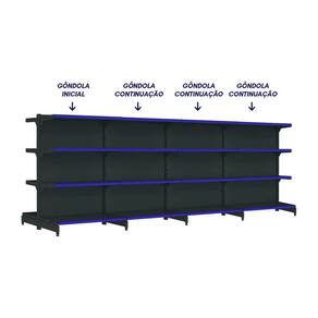 Nosso kit com 4 gôndolas de centro na cor preta é ideal para armazenamento e exposição de produtos em supermercados, mercearias, farmácias, lojas de utilidades, materiais de construção, agropecuárias, e muito mais, variando de acordo com a capacidade de peso de cada modelo.com 1,37m de altura, esta gôndola proporciona uma exibição eficiente dos produtos, maximizando o espaço vertical da sua loja e permitindo uma organização prática e acessível.as gôndolas possuem uma capacidade de 40kg por bandeja. com pintura eletrostática epóxi, antibacteriana, uniforme e resistente.possui bandejas com inclinação em 3 posições e bandejas reguláveis na coluna a cada 25mm, o que permite adição de bandejas extras. a bandeja é construida em chapa 26 (espessura de 0,50mm). fundo da bandeja quadrado para melhor exposição.pés com regulagem de altura, colunas dupladas e tratamento especial da superfície.a gôndola é prática e fácil de montar, com sistema de encaixe sem utilização de parafusos. você pode instalar suas gôndolas rapidamente, sem complicações, permitindo que você comece a exibir seus produtos em pouco tempo.todas as nossas gôndolas possuem qualidade, resistência e durabilidade garantidas pelo uso de matérias-primas de alto padrão, processos produtivos com a mais atual tecnologia e um cuidado especial em cada etapa.modernas e elegantes, nossas gôndolas são projetadas para destacar seus produtos e criar um ambiente agradável de compras para seus clientes, incentivando a exploração e aumentando as vendas.aproveite ao máximo cada centímetro disponível em sua loja com nossas gôndolas projetadas para maximizar o espaço de exposição, permitindo uma ampla variedade de produtos em um layout eficiente.- capacidade de 40kg por bandeja;- colunas dupladas: com sistema de encaixe, sem utilização de parafusos;- tecnologia exclusiva de apoio sgl;- pés reforçados e com regulagem;- bandejas inclináveis: oferece 3 opções para melhor exposição;- bandejas reguláveis a cada 25mm: possibilidade de adicionar bandejas extras;- reforço na base e bandeja: para maior capacidade de carga e estabilidade;- bandeja é construida em chapa 26;- ponteira da coluna: maior proteção e durabilidade.*porta etiquetas: vendidos separadamente, em variadas opções de cores.> o kit contém- 01x gôndola new premium 1,37m preta centro inicial- 03x gôndola new premium 1,37m preta centro continuação> especificaçõesgôndola centro inicialmodelo: gôndola de centro iniciallinha: fit 40altura: 1,37mcor: pretaquantidade de bandeja: 8 (4 em cada lado)peso suportado por bandeja: 40kgchapa: 26gôndola centro continuaçãomodelo: gôndola de centro continuaçãolinha: fit 40altura: 1,37mcor: pretaquantidade de bandeja: 8 (4 em cada lado)peso suportado por bandeja: 40kgchapa: 26> medidas do produtogôndola centro inicialaltura: 1,37mlargura: 0,96mpeso: 28kglargura da bandeja: 0,90mprofundidade da bandeja base: 0,40mprofundidade das bandejas superiores: 0,30mgôndola centro continuaçãoaltura: 1,37mlargura: 0,93mpeso: 23kglargura da bandeja: 0,90mprofundidade da bandeja base: 0,40mprofundidade das bandejas superiores: 0,30m> garantia- 6 meses> troca e devoluçãomediante termos da política de trocas e devoluções da empresa.