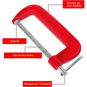Kit 2 Grampos Sargento 6 Pol. Tipo C em Ferro Reforçado Charbs Grampo Sargento 6 Pol. 150mm Tipo C. Corpo em ferro fundido, Fuso em aço especial. Utilizado em marcenarias para firmar ou prender peças que necessitem ser trabalhadas ou coladas. - Marca: Charbs - Kit com 2 unidades - Abertura: 6 Pol 150mm - Comprimento total: 225mm - Comprimento da garganta: 70mm - Largura: 90mm - Cor: vermelho - Corpo em ferro fundido - Fuso em aço especial - Utilizado principalmente em marcenarias para firmar ou prender peças que necessitem ser trabalhadas ou coladas - Peso bruto: 530 gramas - : 90 dias Marca: Não Informado