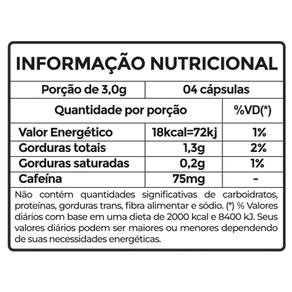 Ingredientes: Guaraná em pó, açaí desidratado em pó, óleo de soja e emulsificante lecitina de soja. Composição da cápsula: gelatina, água purificada, umectante glicerina e corantes vermelho azorrubina, vermelho 40 e azul patente v. Não contém glúten. Alérgicos: contém derivados de soja.