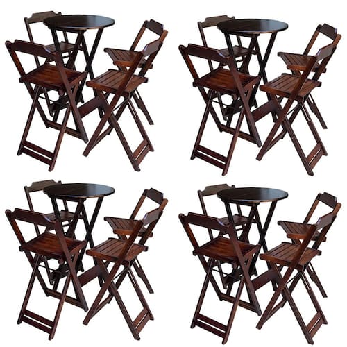 Kit 4 Jogos De Mesa Bistrô De Madeira Com 4 Cadeiras Dobravel Ideal Para Bar E Restaurante Imbuia é ideal para bares, restaurantes, estabelecimentos, áreas de lazer e tambem para sua casa. Feito em madeira maciça, tornando resistentes e duráveis. Seu design permite que seja encaixado em qualquer ambiente, trazendo um toque a mais para seu estabelecimento. Além de sua durabilidade, o que lhe trará conforto para servir seus clientes. Por ser dobrável torna-se mais fácil guardar, manusear e limpar o produto. Atenção: EVITE USAR PRODUTOS ABRASIVOS E QUíMICOS PARA LIMPEZA DO PRODUTO, aconselha-se o uso de pano umedecido para melhor conservação; mantenha o produto fora de chuva e sol constantes. OBS: MDF ULTRA