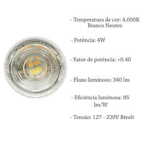 - base: gu10 - formato: mr11 - temperatura de cor: 4000k branco neutro - tensão: bivolt - potência: 4w - fator de potência: 0.40 - fluxo luminoso: 340 lm - eficiência luminosa: 85 lm/w - ângulo de abertura: 38 - vida útil : 25.000 horas - temp. De operação: -20c 40c - frequência: 50/60hz Ean: 7891072789923