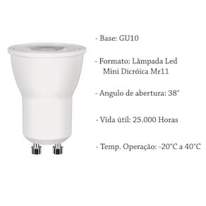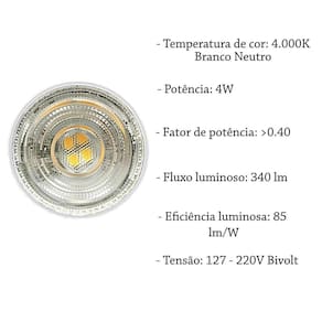- base: gu10 - formato: mr11 - temperatura de cor: 4000k branco neutro - tensão: bivolt - potência: 4w - fator de potência: 0.40 - fluxo luminoso: 340 lm - eficiência luminosa: 85 lm/w - ângulo de abertura: 38 - vida útil : 25.000 horas - temp. De operação: -20c 40c - frequência: 50/60hz