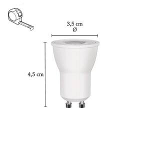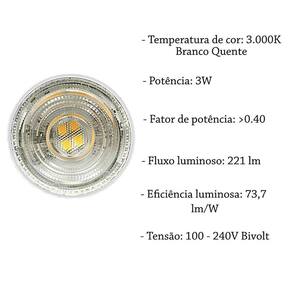 - base: gu10 - formato: mr11 - temperatura de cor: 3000k branco quente - tensão: bivolt - potência: 3w - fator de potência: 0.40 - fluxo luminoso: 221 lm - eficiência luminosa: 73,7 lm/w - ângulo de abertura: 38 - vida útil : 25.000 horas - temp. De operação: -20c 40c - frequência: 50/60hz Ean: 7891072789886