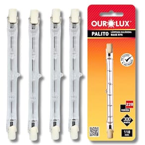 A lâmpada halógena palito 300w 220v j118 ourolux oferece alta luminosidade e excelente desempenho para refletores, luminárias e sistemas de iluminação externa ou interna. Ideal para ambientes que exigem luz intensa e foco, proporciona acendimento instantâneo e maior vida útil se comparada às lâmpadas incandescentes comuns. Compatível com soquete r7s.