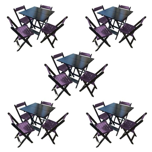 Kit 5 Mesas De Madeira Dobrável Preto 70x70 Com 4 Cadeiras Dobráveis Roxo É ideal para bares, restaurantes, estabelecimentos, áreas de lazer e também para sua casa. Feito em madeira maciça, seu design permite que seja encaixado em qualquer ambiente, trazendo um toque a mais para seu estabelecimento. Por ser dobrável torna-se mais fácil de guardar, manusear e limpar o produto.