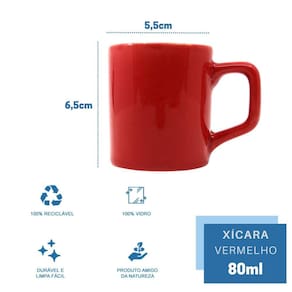 Conjunto de Xícaras de 80ml Com um acabamento em alto brilho e um design moderno, essa xícara é uma excelente escolha para quem quer dar um toque de elegância à sua cozinha ou sala de estar. A cor vibrante e marcante do vermelho dá um destaque especial à peça, tornando-a ainda mais atraente. Se você é um amante de café e quer ter uma xícara de qualidade para saborear sua bebida preferida, essa opção de 80ml na cor vermelha é uma excelente escolha