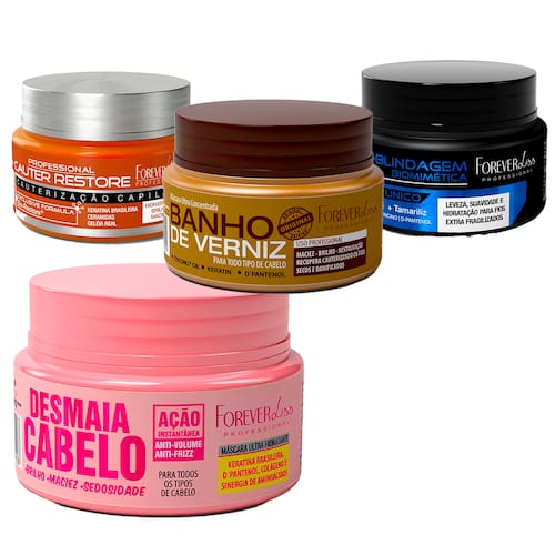 Contém 01 - Mini Máscara Cauter Restore Forever Liss 40g 01 - Mini Máscara Blindagem Capilar Biomimética Forever Liss 40g 01 - Mini Máscara Desmaia Cabelo 40g Forever Liss 01 - Mini Máscara Banho de Verniz Forever Liss 40g