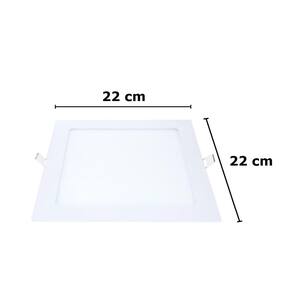 Informações técnicas: LED integrado Potência: 18W Temperatura: 6500K Emissão de luz fria Medida: 22x22 cm Forma: Quadrado Lúmens: 1260 IRC: =70 Ângulo de abertura: 120 Material: Corpo em alumínio, difusor em vidro, corpo do driver em plástico Eficiência luminosa: 70lm/W Painel de embutir Vida útil: 25 mil horas L70 Pode ser ligado diretamente na rede elétrica em 127V ou 220V Espessura do forro deve ser pelo menos 1cm Não permite dimerização