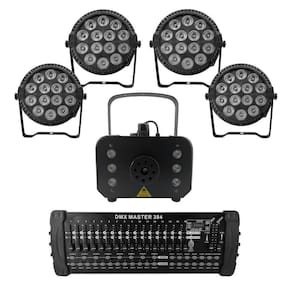 Itens inclusos: 04 par led slim 14x12w rgbw + 01 máquina de fumaça 1200w com iluminação rgb + 01 mesa controladora dmx 384