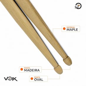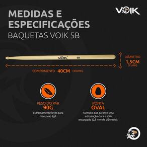 Especificações • Marca: Voik • Modelo: 5B • Madeira: Maple • Formato da Ponta: Oval • Diâmetro da baqueta: 1,5 mm • Diâmetro da ponta da baqueta: 1 mm • Comprimento: 40 cm • Peso do par: 90 g