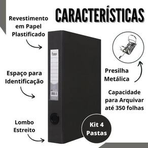Especificações- Pasta A-Z- Contém 4 Pastas AZ Lombo Estreito- Tamanho Ofício – 28cm x 34,5cm – Lombo: 6cm- Cores Disponíveis - Preto - Revestimento Externo em Papel Plastificado;- Papeletas com tamanho apropriado para espaço de identificação;- Capacidade de Armazenar até 350 filhas.- Marca: Frama