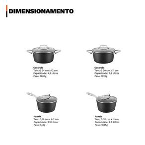 Distribuído por feheros shop Conjunto 4 peças premium revestimento titânio antiaderente antirrisco indução 4,5mm Atenção As panelas com revestimento em titânio oferecem altíssimo desempenho antiaderente e resistência superior a riscos e abrasões. Ainda assim, é importante lembrar que nenhum revestimento é 100% antiaderente sem o uso de pequenas quantidades de óleo ou gordura, especialmente em altas temperaturas. O titânio é reconhecido por sua durabilidade e segurança, sendo uma excelente opção para quem busca praticidade, saúde e resistência em um único conjunto. Não libera substâncias tóxicas, mesmo sob altas temperaturas, e oferece um cozimento mais uniforme e eficiente. - panelas premium com certificação inmetro nível a - não permita que a chama do fogão ultrapasse a base das panelas - produto não compatível com lava-louças - siga as instruções do fabricante para garantir maior durabilidade do produto Informações do produto: - ultra resistência: o revestimento em titânio é antirrisco, ultra durável e fácil de limpar - cozimento uniforme: espessura de até 4,5mm que distribui o calor de forma constante, economizando tempo e energia - livre de pfoa: mais segurança para o preparo dos seus alimentos - compatível com indução e forno: todas as peças são compatíveis com fogões a gás, elétrico, vitrocerâmico e indução. Podem ir ao forno devido às alças em aço inox - segurança e conforto: alças em aço inox altamente resistentes e tampas de vidro temperado com saída de vapor - design sofisticado: visual premium na cor preta com acabamento moderno e funcional Especificações técnicas: - pode ser em todos os tipos de fogões existentes no mercado: a gás, elétrico, vitrocerâmico, indução e forno - revestimento interno em titânio com tecnologia antirrisco de alta durabilidade - alças e cabos em aço inox, altamente resistentes, permitindo o uso seguro no forno - tampa de vidro temperado com saída de vapor, que facilita o monitoramento do preparo sem perder calor - superfície antiaderente que evita que os alimentos grudem, permitindo o uso de menos óleo no preparo - livre de pfoa, substância tóxica presente em antiaderentes convencionais Ficha técnica do produto: - panela 16 p : 16 cm x 8,3 cm - 1300 ml - peso: 514 g - panela 20 m : 20 cm x 11 cm - 2800ml peso: 1065 g - caçarola 20 m : 20 cm x 11 cm - 2800 ml - peso: 1226 g - caçarola 24 g : 24 cm x 12 cm - 4300 ml - peso: 1600 g Antes do primeiro uso cura do produto : - lave cada peça com esponja macia e detergente neutro - seque bem com um pano seco - aplique uma fina camada de óleo no interior - leve ao fogo baixo por 2 minutos - desligue, aguarde esfriar e lave novamente antes do primeiro uso Após o uso: - deixe a panela esfriar antes de lavar - use esponja macia e detergente neutro - enxágue bem e seque com pano macio - evite produtos abrasivos e utensílios metálicos - para resíduos difíceis, deixe de molho em água morna por alguns minutos - não utilize lava-louças para preservar o revestimento Itens inclusos no pacote: - 01 panela 16 cm revestimento titânio 1,3l com tampa de vidro - 01 panela 20 cm revestimento titânico 2,8l com tampa de vidro - 01 caçarola 20 cm revestimento titânio 2,8l com tampa de vidro - 01 caçarola 24 cm revestimento titânio 4,3l com tampa de vidro Todas as fotos são reais dos produtos. Qualquer dúvida, estamos à disposição Dúvidas frequentes 01 - o produto é compatível com fogão de indução R: sim. Todas as peças possuem fundo triplo, compatíveis com fogões a gás, elétrico, vitrocerâmico e de indução. 02 - as peças podem ir ao forno R: sim. Todas possuem alças em aço inox e são seguras para uso em forno convencional. 03 - o produto é novo Possui