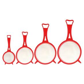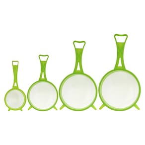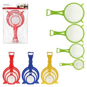 O kit é composto por (04) quatro peneiras de tamanhos variados, que permitem a realização de tarefas como coar alimentos, separar materiais por granulometria ou filtrar substâncias. As peneiras são coloridas, o que facilita a identificação dos diferentes tamanhos durante o uso.