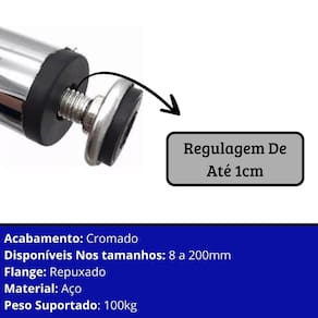 Benefícios: Versatilidade: Disponível em diferentes alturas para atender diversas necessidades de design e funcionalidade. Durabilidade: Produzido em metal robusto com acabamento cromado, garantindo longa vida útil. Estabilidade: Fixação segura com 4 pontos de parafuso para maior firmeza. Nivelamento perfeito: Ajuste de até +1cm para adaptação em pisos irregulares. Alta capacidade: Ideal para móveis pesados, com capacidade de até 100kg por unidade.