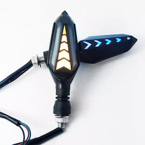Kit 4 pisca palito slim seta led sequencial moto universal Piscas para motos com luz de led e corpo em plástico e acrílico, na cor preta, com luz sequencial laranja e azul na parte de trás, e luz branca na frente não sequencial . Um novo modelo mais moderno para sua moto.