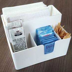O kit de porta sachês e guardanapos proporciona mais praticidade às suas refeições, além de deixar sua mesa ou bancada organizadas. Os molhos são parte fundamental na hora da degustação do alimento e os guardanapos são indispensáveis, por isso estes organizadores também são ideais para mesas de restaurantes, bistrôs, bares, cafés, lanchonetes e uma ótima escolha para quem tem seu próprio negócio. Com estes suportes você facilita seu dia a dia da melhor maneira, pois cada um possuí: dois espaços para você organizar os sachês, um espaço para organizar palitos ou colherinhas e um espaço para acomodar os guardanapos, proporcionando melhor acomodação de seus itens. Os organizadores possuem design casual e compacto, por isso, se adaptam facilmente à decoração já existente no ambiente.