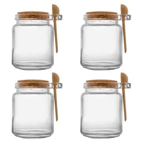 - Capacidade: 240ml. - Dimensões da colher: 8,5cm X 1,7cm - Medidas do pote: 9,5cm X 6,5cm Altura X Largura - Cor: Transparente - Material: Vidro borossilicato - Kit 4 Potes Ean: 7899766709592