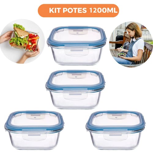 Nome do Produto: Kit 4 Pote de Vidro Hermético Quadrado 1200ml