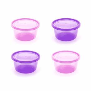 Kit com 4 Potes com tampas de 236 ml cada Não mancham Resistentes e duráveis, podem ir ao micro-ondas, congelador ou lava-louças Empilháveis, facilitam o armazenamento 100% atóxico, livre de BPA (Bisfenol-A e Ftalatos) e PVC Amigável ao meio ambiente, feito em Polipropileno virgem reciclável