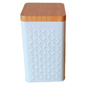 Especificações: Cores: Branco ou Cinza com detalhe amadeirado Material: Metal Dimensões: 10 cm (largura) x 10 cm (comprimento) x 16 cm (altura) Tampa: Metal com acabamento que imita bambu, garantindo vedação ainda mais eficiente