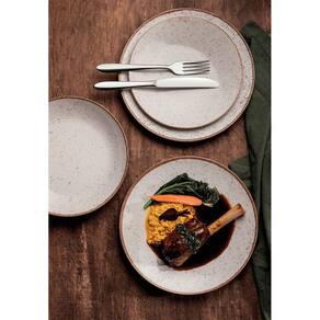 Kit com 4 pratos rasos Diâmetro: 28 cm Material: Porcelana Acabamento rústico com design elegante Alta resistência e durabilidade Baixa absorção de umidade Compatível com micro-ondas e lava-louças Ideal para servir pratos principais com estilo e sofisticação