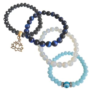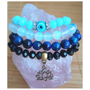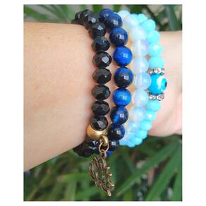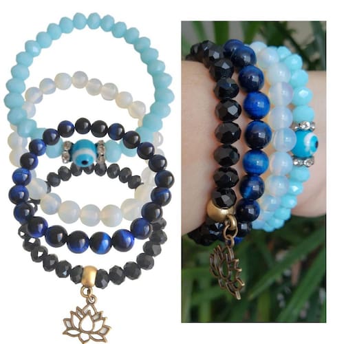 Kit 4 Pulseiras em Pedra Olho de Tigre Azul e Pedra da Lua Kit com 4 Pulseiras Pedras Olho de Tigre Azul, Pedra da Lua e Cristais nas Cores Preto e Azul Claro Confeccionado artesanalmente com Pedras Naturais: 1 Pulseira Pedra Olho de Tigre Azul 1 Pulseira Pedra da Lua 1 Pulseira Cristal preto com pingente Flor de Lótus 1 Pulseira Cristal azul claro com Olho Grego e entremeio com Strass Pingentes: Flor de Lótus Detalhe na pulseira azul claro: Olho Grego A proteção das Pedras com estilo e sofisticação Exalando Personalidade e um ar misterioso Sobre a Pedra Olho de Tigre Azul: Com efeitos calmantes, adotando uma atitude mais calma e descontraída proporciona relaxamento, reduz o , ansiedade e fobias. Corresponde ao Chakra Frontal responsável pela intuição. Sobre a Pedra da Lua: A Pedra da Lua é um símbolo do poder feminino. Equilibra as emoções, aguça a intuição e a sensibilidade feminina. Marca: Não Informado
