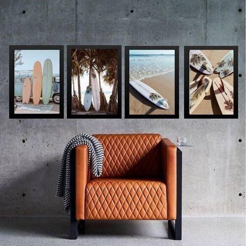 Kit 4 quadros coleção praia surf - pranchas 24x18cm Moldura: madeira preta Informações do produto tire todas as suas dúvidas no descritivo abaixo: decoração para quarto, sala, cozinha, escritório, área gourmet e muito mais. Chega de paredes vazias medidas - cada peça tem 24x18cm a5 . Material do papel - papel fotográfico brilhante de altíssima resolução acabamento - todos os quadros são acompanhados de uma película de acetato para proteção da imagem. - os quadros são embalados de forma segura com plástico bolha com camada dupla de acordo com o tamanho dos quadros. Garantia - garantia de 3 meses. Meu quadro chegou. Como posso fixá-lo Você precisa apenas de um martelo e um prego, pois os quadros já vão acompanhados de penduradores. Esta é a forma mais indicada. Caso prefira, você pode utilizar uma fita dupla face neste caso, sugerimos de alta qualidade para evitar que descole e seu quadro caia . Como posso limpar meu quadro A limpeza é feita como um móvel comum da sua casa. Apenas um pano seco ou espanador são suficientes para tal